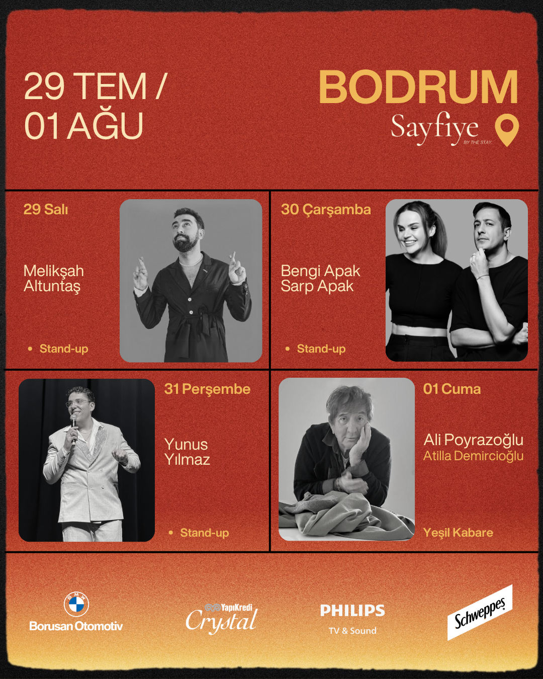 29 Temmuz’da Melikşah Altuntaş, 30 Temmuz’da Bengi Apak & Sarp Apak, 31 Temmuz’da ise komedyen Yunus Yılmaz, Sayfiye Beach’te gerçekleşecek gösterilerle seyircinin karşısında olacak. ‘Komedi Kulüp Tatilde’, sezonu duayen sanatçı Ali Poyrazoğlu ile Harun Tekin & Koray Candemir ile sonlandıracak. Poyrazoğlu, 1 Ağustos’ta ‘Yeşil Kabare’ oyunuyla, Harun Tekin ve Koray Candemir ise Şakalı Akustik gösterisiyle 2 Ağustos’ta sahnede olacak.