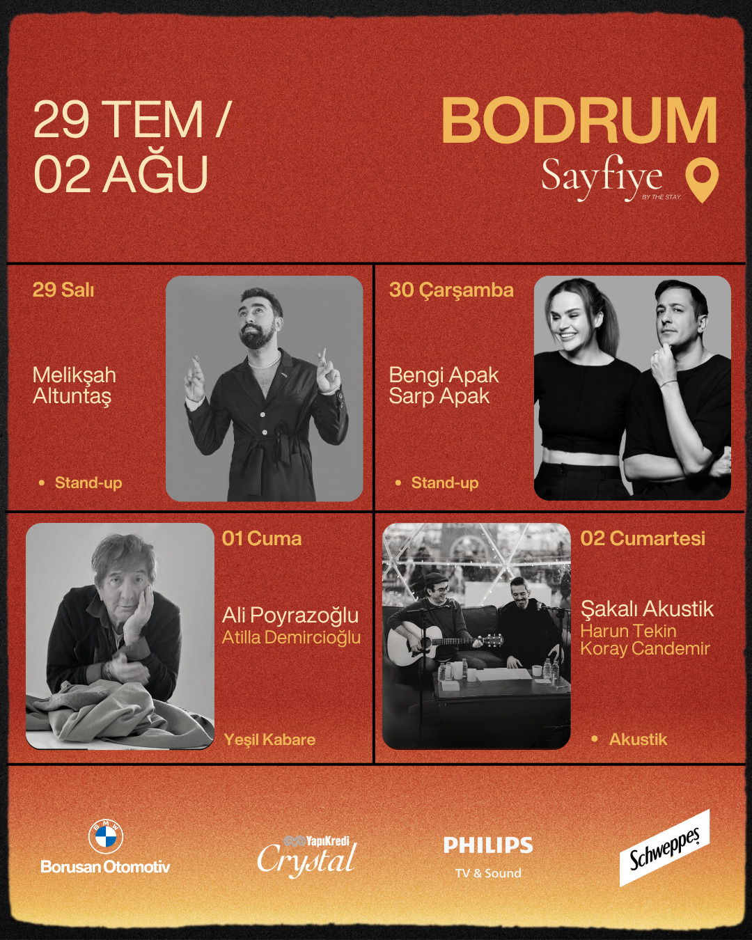 29 Temmuz’da Melikşah Altuntaş, 30 Temmuz’da Bengi Apak & Sarp Apak, gerçekleşecek gösterilerle seyircinin karşısında olacak. ‘Komedi Kulüp Tatilde’, sezonu duayen sanatçı Ali Poyrazoğlu ile Harun Tekin & Koray Candemir ile sonlandıracak. Poyrazoğlu, 1 Ağustos’ta ‘Yeşil Kabare’ oyunuyla, Harun Tekin ve Koray Candemir ise Şakalı Akustik gösterisiyle 2 Ağustos’ta sahnede olacak.